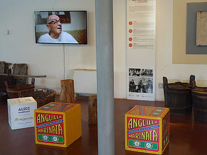 Das Aal-Museum liegt hinter einem Loggien-Gang und ist ein Beispiel für die Industrie-Architektur des frühen 20. Jahrhunderts. Seinerzeit war hier die Manufaktur zum Marinieren untergebracht, in deren “Feuersaal” an zwölf Feuerstellen Aale zunächst am Speiß gegart wurden, um anschließend mariniert und in Konserven verpackt zu werden.Das Museum zeigt dieses Geschichte in Objekten (wie Fischerbooten, die ins Museum hinein zu fahren scheinen), Bildern und audiovisuellen Medien. In jedem Spätherbst wird in Zusammenarbeit mit Slow Food die traditionelle Produktionsweise noch einmal anschaulich, wenn im “Feuersaal” tatsächlich wieder eingeheizt wird.