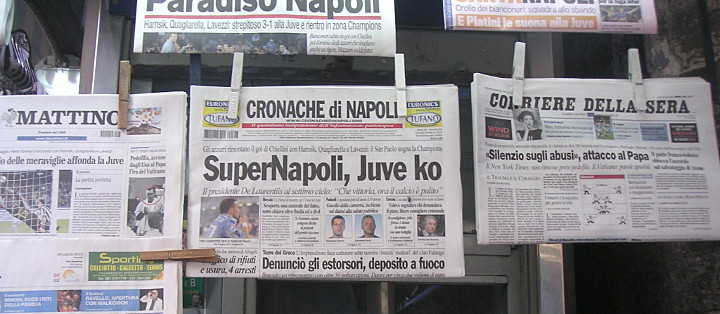 Wo Arbeitslosigkeit ist, drohen soziale Probleme in Form von Kriminalität, und die hat Neapel nicht nur schon lange in Form der Camorra, sondern in letzter Zeit auch in Gestalt einer zunehmend enthemmten, gewaltbereiten Jugendkriminalität,{{3}} die in Deutschland einem größeren Publikum durch die Arbeiten Roberto Savianos bekannt geworden ist. Als Tourist kriegt man in der Regel davon nicht viel mit, doch die negativen Folgen für das soziale Zusammenleben in der Stadt sind unabsehbar. Und das ist schade, denn früher war Neapel trotz auch damals verbreiteter Armut eine sehr solidarische Stadt, in der z.B. der caffè sospeso (dt.: ausstehender Kaffee) erfunden wurde: Ein wohlhabender Bürger trinkt in der Bar einen Kaffee und bezahlt zwei – der zweite ist für einen Bedürftigen, der bei Kaffeedurst sich beim buchführenden Barista erkundigt, ob noch ein kostenloser caffè sospeso zu haben sei. Neapolitaner, das sind eben nicht nur (einige) Kriminelle, sondern vor allem viele herzensgute, hilfsbereite Menschen. In Italien gilt “der” Neapolitaner als etwas laut und überschwenglich, er hat fast immer guter Laune, er singt während des Mandoline-Zupfens, und er ist begeisterungsfähig für vieles, vor allem aber für seine Fußballmannschaft SSC Napoli. Und diese Begeisterung kann sich auch in einem in der Altstadt an einer Ecke angebrachten Devotionalien-Schrein äußern, in dem ein “heiliges und wundertätiges” Haar des Fußballspielers Diego Maradona, der 1984-1991 für Neapel spielte, verehrt wird.