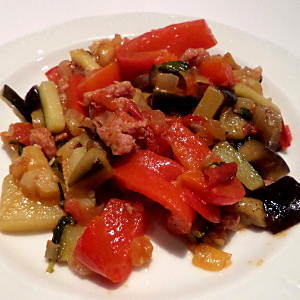 Lukanische GemüsepfanneIn Mittel- und Süditalien kennt man dieses Gericht, das in vielen Varianten mit sommerlichen Gemüsen gekocht wird. Typisch für die lukanische Gemüsepfanne ist die Beifügung von Wurst.