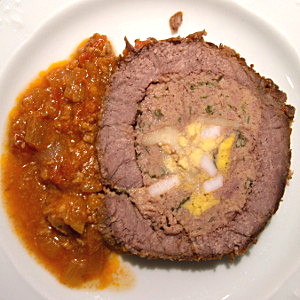 Gefüllter KalbsrollbratenEin ursprünglich aus Palermo stammender Festtagsbraten ist der gefüllte Kalbsrollbraten, bei dem eine große Kalbfleischroulade eine köstliche Füllung aus Ei, Käse, Gehacktem, Tomaten usw. verbirgt.